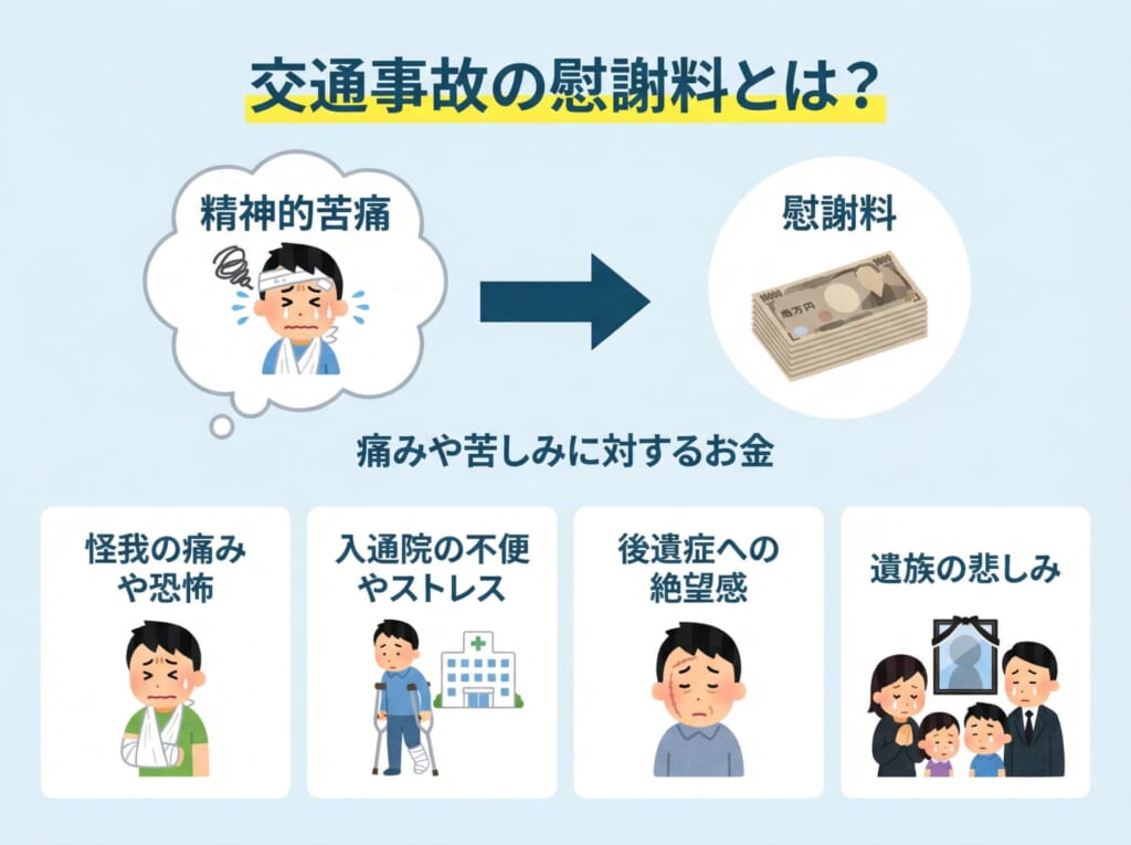 交通事故の慰謝料とは、被害者が感じる痛みや治療のストレス、遺族の悲しみといった精神的苦痛を和らげ、償うために支払われるお金のことです。