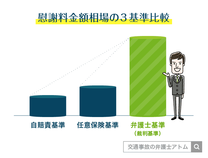 多くの場合、加害者側の保険会社は支払う金額を少しでも安くするため、「自賠責基準」または「任意保険基準」に基づく相場よりも低い金額の慰謝料を提示してきます。