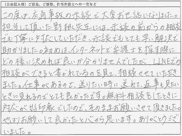 示談の前からの相談でも丁寧に対応して頂き、示談でもとても早い解決で助かりました。初めはインターネットで弁護士を探す際にどの様に決めればよいか分かりませんでしたが、LINEでの相談ができると書かれてあるのを見て相談させていただきました。無料相談をしたときに対応が好印象でしたので、そのままお願いさせていただきました。やはりお願いして良かったと心から思います。ありがとうございました。