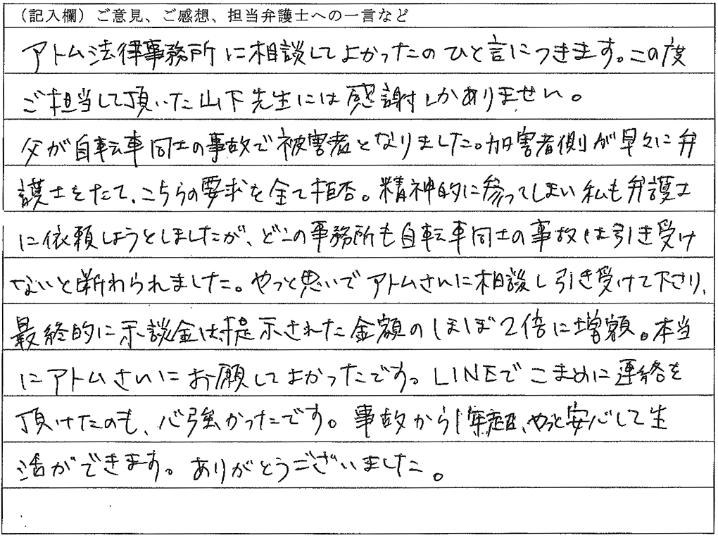 アトム法律事務所に相談してよかったのひと言につきます。この度ご担当して頂いた山下先生には感謝しかありません。父が自転車同士の事故で被害者となりました。加害者側が早々に弁護士をたて、こちらの要求を全て拒否。精神的に参ってしまい、私も弁護士に依頼しようとしましたが、どこの事務所も自転車同士の事故は引き受けないと断わられました。やっとの思いでアトムさんに相談し引き受けて下さり、最終的に示談金は、提示された金額のほぼ2倍に増額。本当に、アトムさんにお願いしてよかったです。LINEでこまめに連絡を頂けたのも、心強かったです。事故から1年経ち、やっと安心して生活ができます。ありがとうございました。