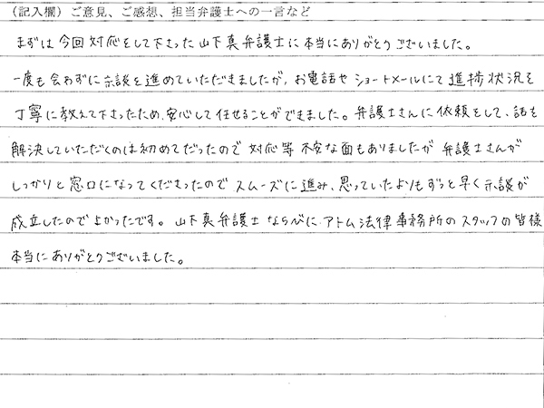 一度も会わずに示談を進めていただきましたが、お電話やショートメールにて進捗状況を丁寧に教えてくださったため、安心して任せることができました。弁護士さんに依頼をして話を解決していただくのは初めてだったので、対応等不安な面もありましたが、弁護士さんがしっかり窓口になってくださったのでスムーズに進み、思っていたよりもずっと早く示談が成立したのでよかったです。山下真弁護士ならびにアトム法律事務所のスタッフの皆様、本当にありがとうございました。