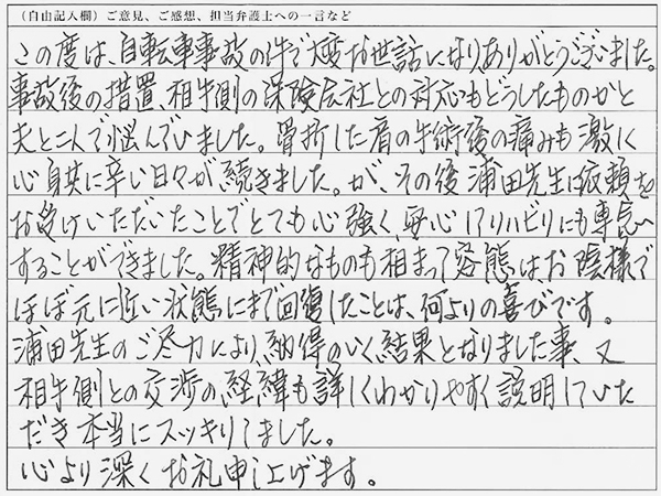 とても心強く、安心してリハビリにも専念することができました。精神的なものも相まって容態はおかげさまでほぼ元に近い状態にまで回復したことは何よりの喜びです。浦田先生の御尽力により、納得のいく結果となりました事、又相手側との交渉の経緯も詳しく分かりやすく説明していただき、本当にスッキリしました。