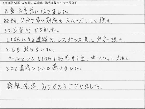 大変お世話になりました。終始、分かり易い対応をスムーズにして頂き、とても安心できました。LINEによる連絡も、レスポンス良く対応いただき、とても助かりました。ツールとしてLINEを利用する点、メリット大きくとても素晴らしいと感じました。
