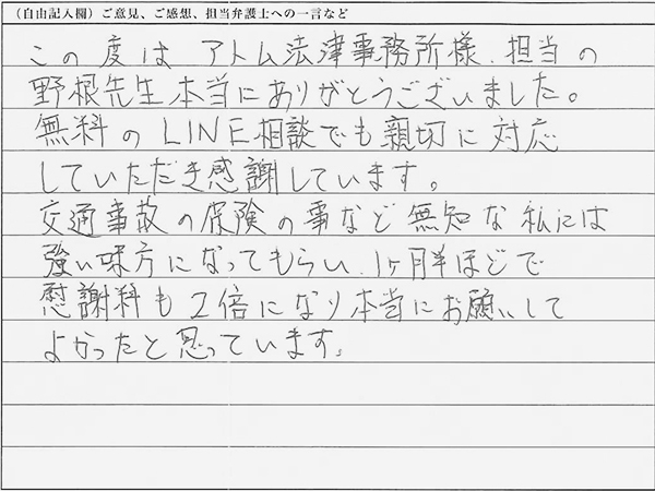 無料のLINE相談でも親切に対応していただき感謝しています。交通事故の保険のことなど無知な私には強い味方になってもらい、1ヶ月半ほどで慰謝料も2倍になり、本当にお願いしてよかったと思っています。