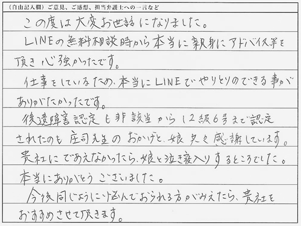 この度は大変お世話になりました。LINEの無料相談時から本当に親身にアドバイスをいただき、心強かったです。仕事をしているため、本当にLINEでのやり取りの出来ることがありがたかったです。後遺障害認定も非該当から12級6号まで認定されたのも、庄司先生のおかげと、娘共々感謝しております。貴社に出会えなかったら、娘と泣き寝入りするところでした。本当に有難うございました。今後同じように悩んでおられる方がみえたら、貴社をおすすめさせていただきます。