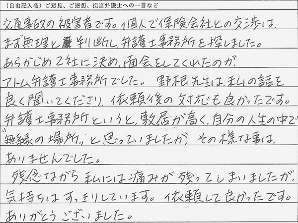 交通事故の被害者です。個人で保険会社との交渉は、まず無理と判断し、弁護士事務所を探しました。あらかじめ2社に決め、面会をしてくれたのが、アトム弁護士事務所でした。野根先生は、私の話を良く聞いてくださり、依頼後の対応も良かったです。弁護士事務所というと、敷居が高く、自分の人生の中で”無縁の場所”と思っていましたが、その様な事は、ありませんでした。残念ながら私には痛みが残ってしまいましたが、気持ちはすっきりしています。依頼して良かったです。ありがとうございました。