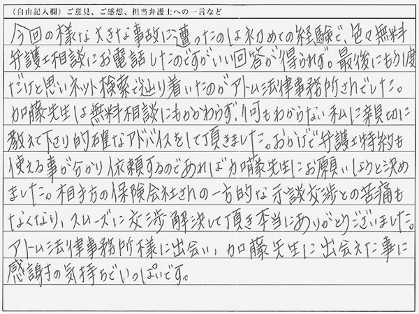 今回の様な大きな事故に遭ったのは初めての経験で、色々無料弁護士相談にお電話したのですがいい回答が得られず。最後にもう1度だけと思いネット検索で辿り着いたのがアトム法律事務所さんでした。