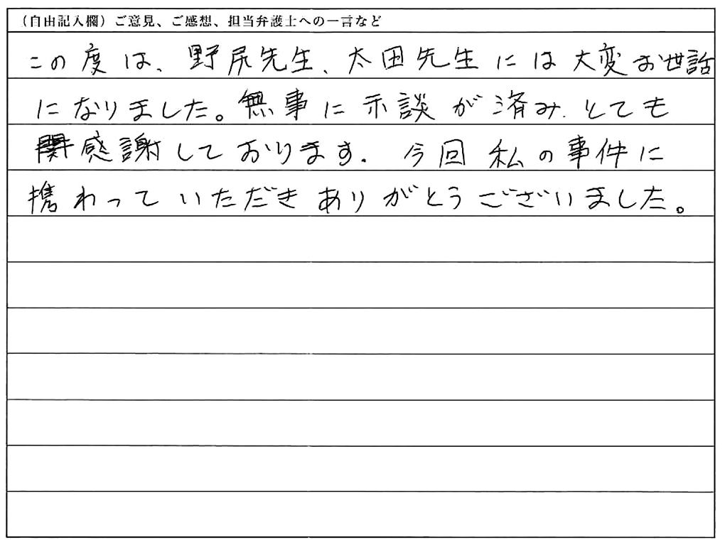 この度は、野尻先生、太田先生には大変お世話になりました。無事に示談が済み、とても感謝しております。今回私の事件に携わっていただきありがとうございました。