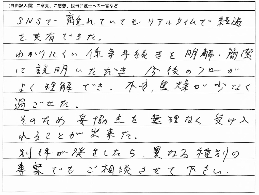 SNSで離れていてもリアルタイムで経過を共有できた。わかりにくい係争手続きを明解、簡潔に説明いただき、今後のフローがよく理解でき、不安、焦燥が少なく過ごせた。そのため妥協点を無理なく受け入れることが出来た。別件が発生したら、異なる種別の事案でもご相談させて下さい。