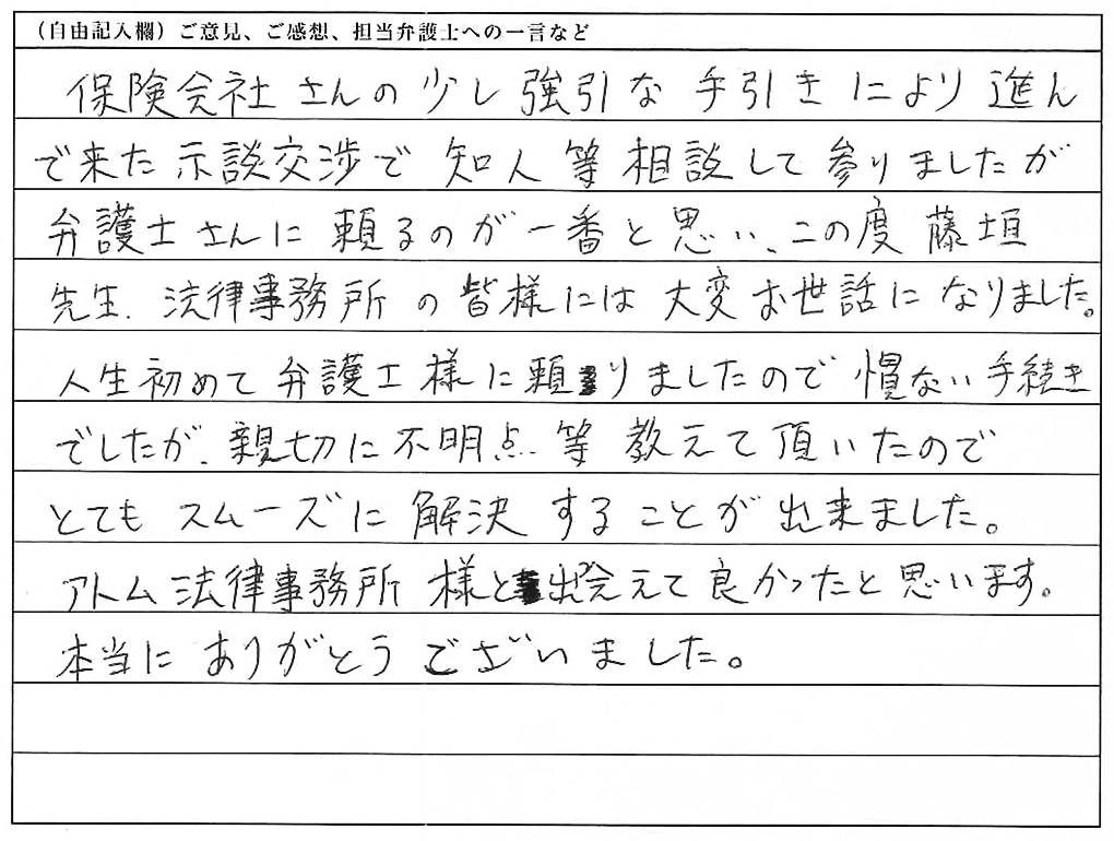 保険会社さんの少し強引な手引きにより進んで来た示談交渉で、知人等相談して参りましたが、弁護士さんに頼るのが一番と思い、この度、先生、法律事務所の皆様には大変お世話になりました。人生初めて弁護士様に頼りましたので、慣れない手続きでしたが、親切に不明点等教えて頂いたので、とてもスムーズに解決することが出来ました。アトム法律事務所様と出会えて良かったと思います。本当にありがとうございました。