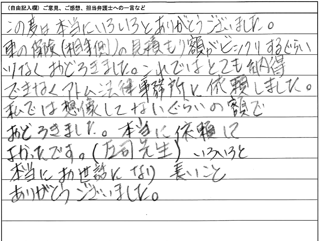 この度は本当にいろいろとありがとうございました。車の保険(相手側)の見積もり額がビックリするくらい少なく、おどろきました。これではとても納得できなく、アトム法律事務所に依頼しました。私では想像してないぐらいの額でおどろきました。本当に依頼してよかったです。(庄司先生)いろいろと本当にお世話になり、長いことありがとうございました。
