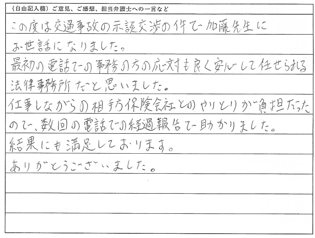 この度は、交通事故の示談交渉の件で、加藤先生にお世話になりました。最初の電話での事務の方の応対も良く、安心して任せられる法律事務所だと思いました。仕事しながらの相手方保険会社とのやりとりが負担だったので、数回の電話での経過報告で助かりました。結果にも満足しております。ありがとうございました。