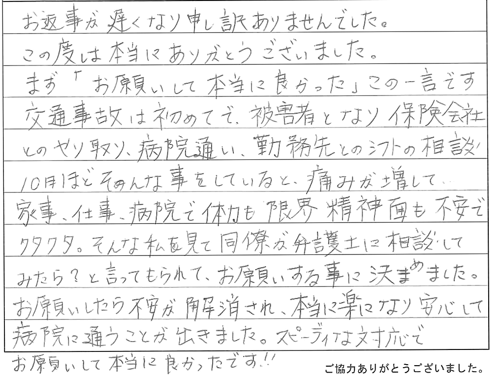 お返事が遅くなり申し訳ありませんでした。この度は本当にありがとうございました。まず「お願いして本当に良かった」この一言です。交通事故は初めてで、被害者となり、保険会社とのやり取り、病院通い、勤務先とのシフトの相談10月ほどそんな事をしていると、痛みが増して、家事、仕事、病院で体力も限界、精神面も不安でクタクタ。そんな私を見て同僚が、弁護士に相談してみたら?と言ってもらえて、お願いする事に決めました。お願いしたら不安が解消され、本当に楽になり安心して病院に通うことが出来ました。スピーディな対応で、お願いして本当に良かったです!!