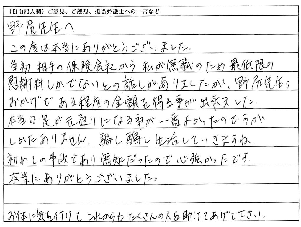 野尻先生へ この度は本当にありがとうございました。当初、相手の保険会社から私が無職のため最低限の慰謝料しかでないとの話がありましたが、野尻先生のおかげである程度の金額を得る事が出来ました。本当は足が元通りになる事が一番よかったのですが、しかたありません。騙し騙し生活していきますね。初めての事故であり無知だったので、心強かったです。本当にありがとうございました。お体に気を付けて、これからもたくさんの人を助けてあげて下さい。