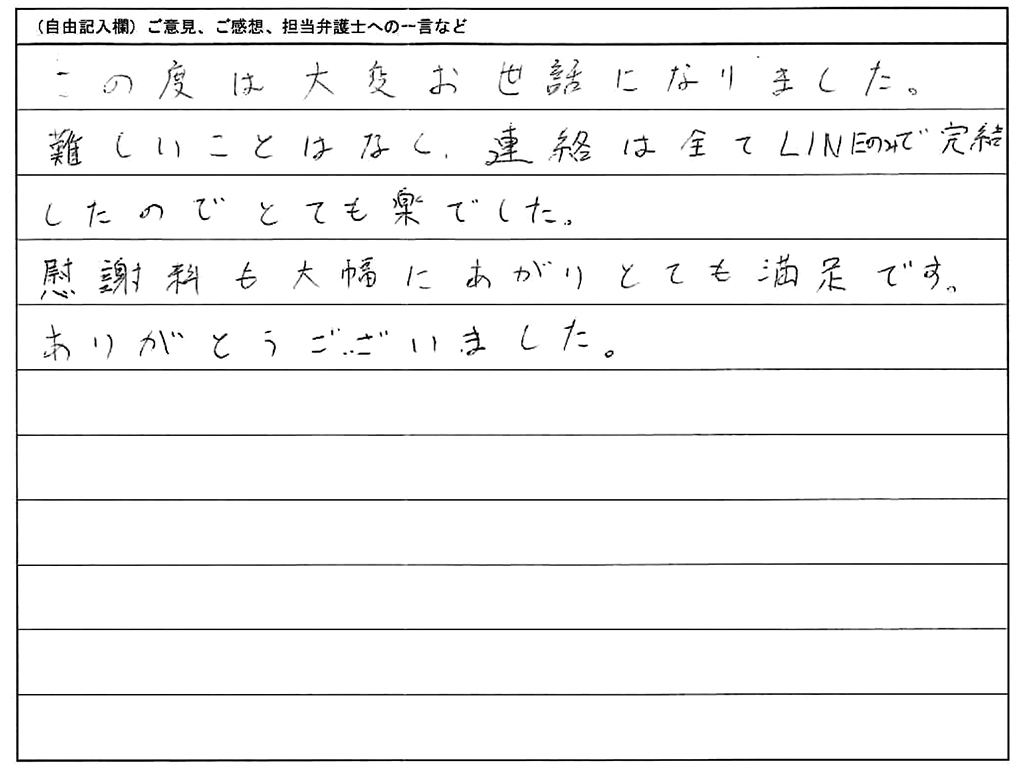 この度は大変お世話になりました。難しいことはなく、連絡は全てLINEのみで完結したのでとても楽でした。慰謝料も大幅にあがりとても満足です。ありがとうございました。