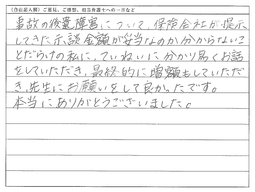 事故の後遺障害について、保険会社が提示してきた示談金額が妥当なのか分からないことだらけの私に、ていねいに分かり易くお話をしていただき、最終的に増額もしていただき、先生にお願いをして良かったです。本当にありがとうございました。