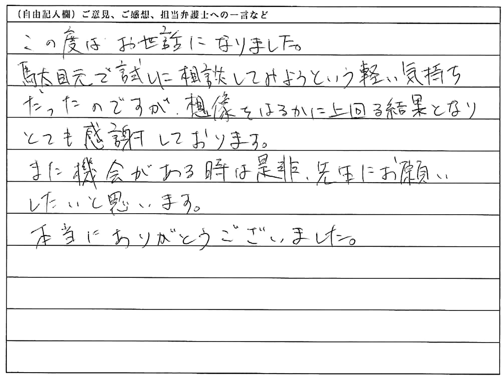 この度はお世話になりました。駄目元で試しに相談してみようという軽い気持ちたったのですが、想像をはるかに上回る結果となり、とても感謝しております。また機会がある時は是非、先生にお願いしたいと思います。本当にありがとうございました。