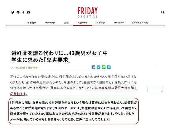 避妊薬を対価とした場合も買春に当たるか等について、弁護士の立場から解説しました。