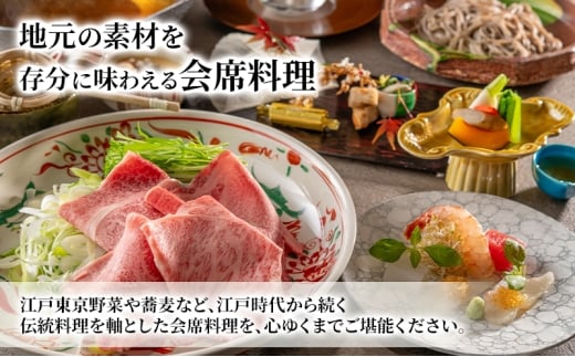 こだわりの蕎麦や東京産食材を取り入れた料理が並び、会席メニューでは江戸時代から伝わる技法が取り入れられています。