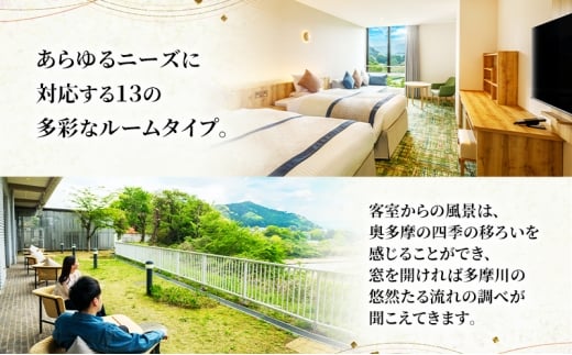 都心から約1時間というアクセスのしやすさに加え、多摩川沿いの静かな環境、奥多摩の山並み、そしてリニューアル後の心地よい館内空間など、日常から離れて過ごしたくなる要素が多く詰まった宿泊施設です。